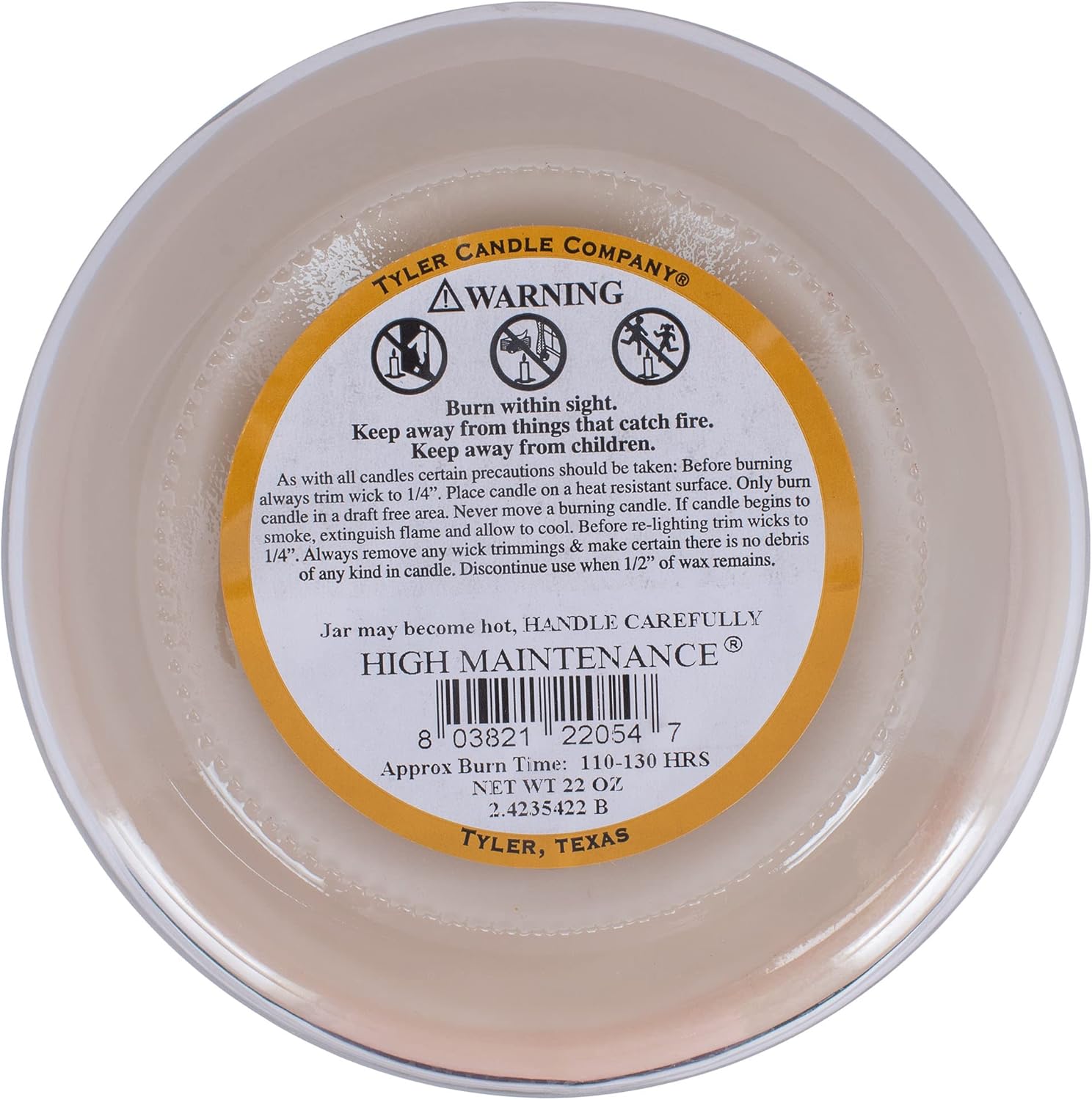 - Size & burn: 22 oz with two wicks, designed to fill larger spaces with a steady fragrance; burn time 110–130 hours. ([amazon.com](https://www.amazon.com/Tyler-High-Maintenance-Burning-Scented/dp/B000OIIM2G?utm_source=chatgpt.com))