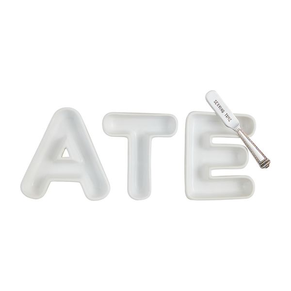 - Includes: wooden serving board (6" x 13"), three ceramic "EAT" tidbit dishes, and a stamped silverplate spreader. ([mudpie.com](https://www.mudpie.com/product/41860022-wood-board-and-tidbit-set?utm_source=chatgpt.com))