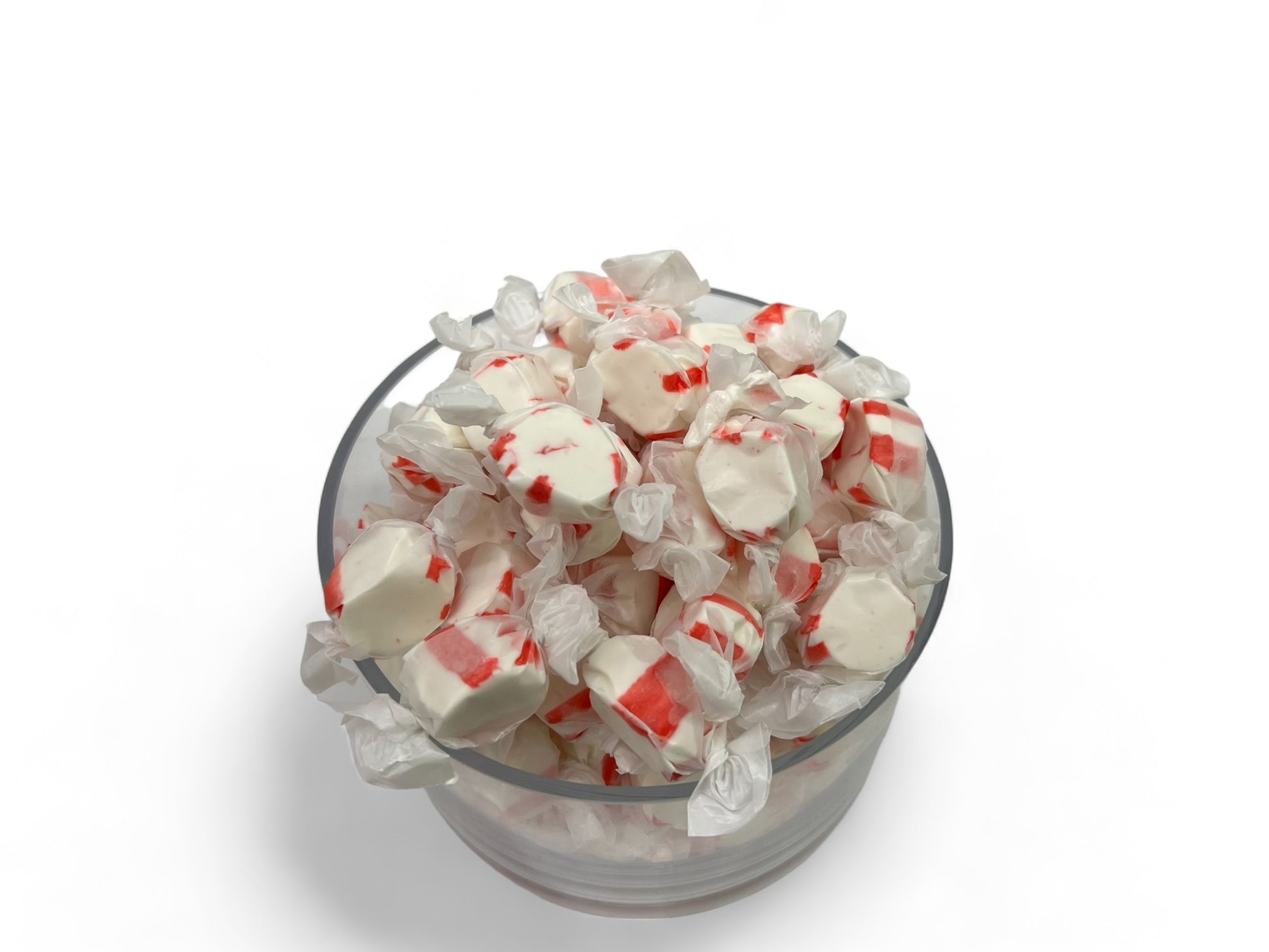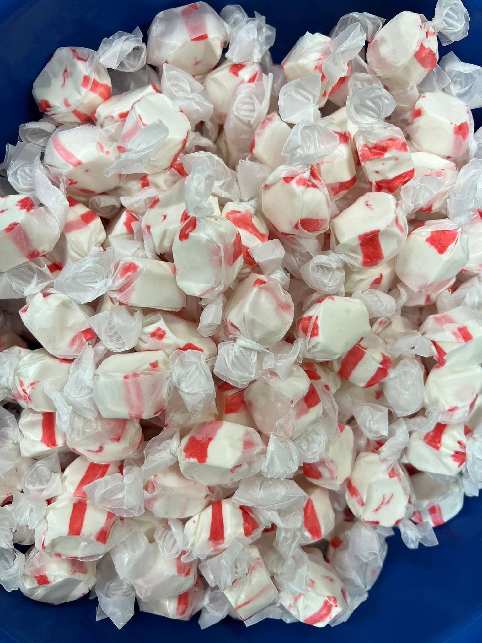 - 1 lb bag of salt water taffy with a bright peppermint flavor for a classic candy treat.