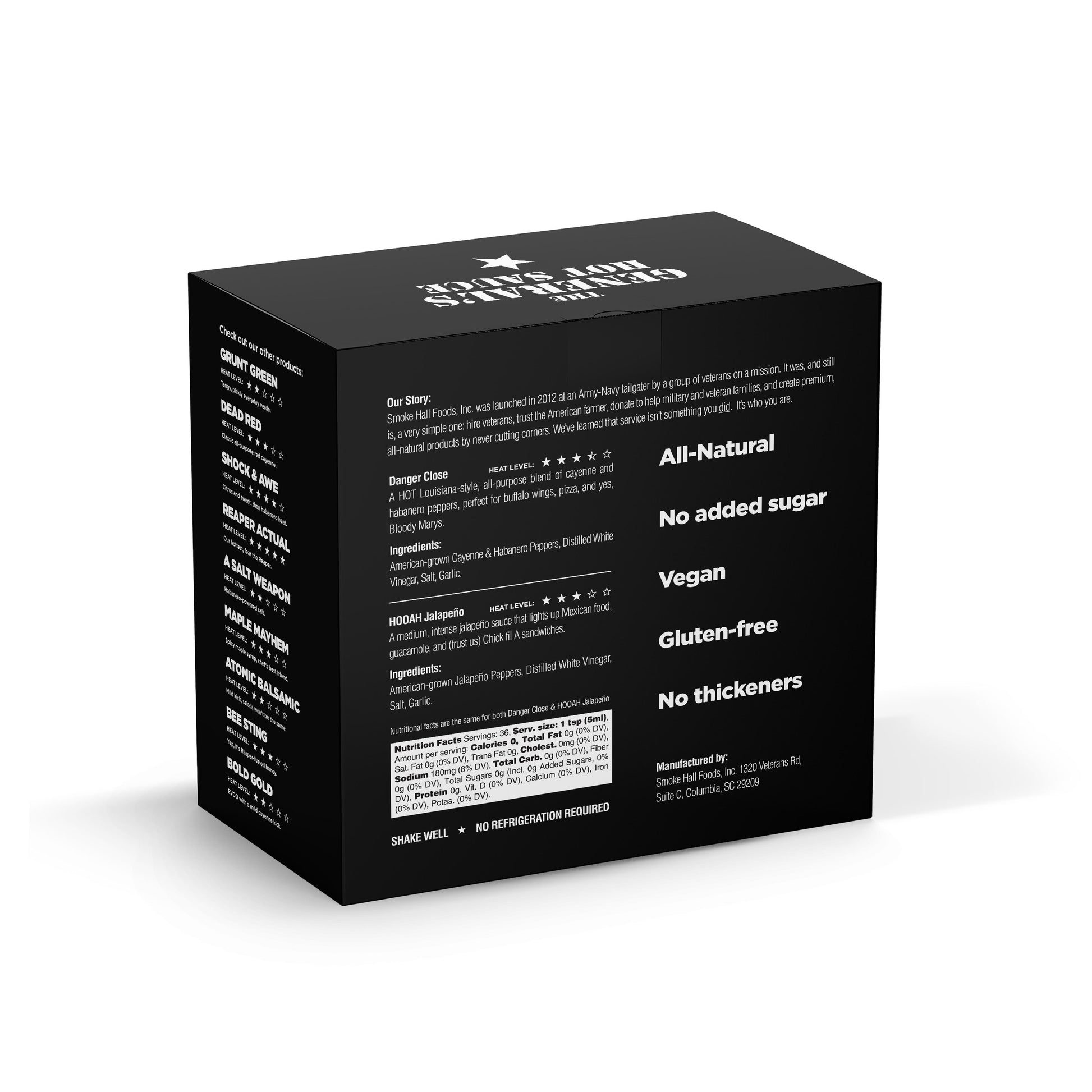 - Two 6 oz bottles included: Danger Close and HOOAH Jalapeño, delivering a dynamic green and red flavor pairing in one set.