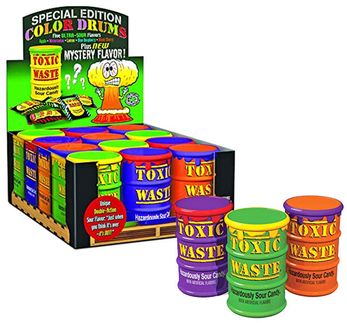 Toxic Waste delivers an exhilarating sour experience for candy lovers seeking a thrilling challenge. This novelty candy stands out in the realm of novelty candies, thanks to its vibrant barrels packed with six dangerously sour flavors, including an exciting mystery flavor that will keep your taste buds guessing and your friends competing!