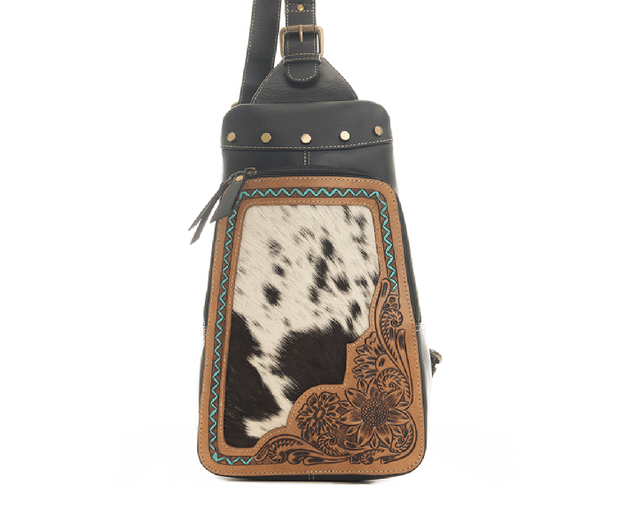 - Hand-Tooled Leather Accent: The artisanal craftsmanship showcases a stunning hair-on hide, adding a distinctive touch that sets it apart from typical sling bags.